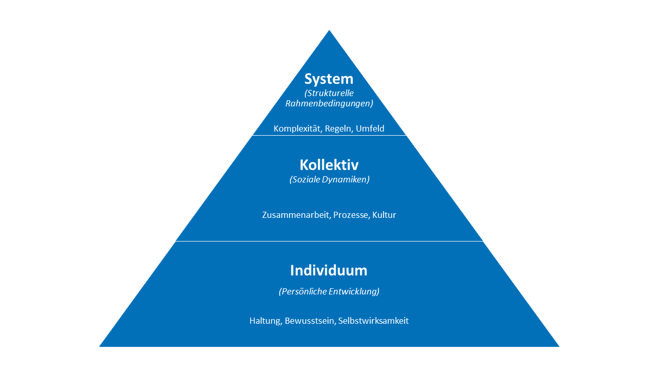 - Ebene Kollektiv: Teams brauchen keine Harmonie, sondern klare Konflikte und Verantwortungsübernahme.